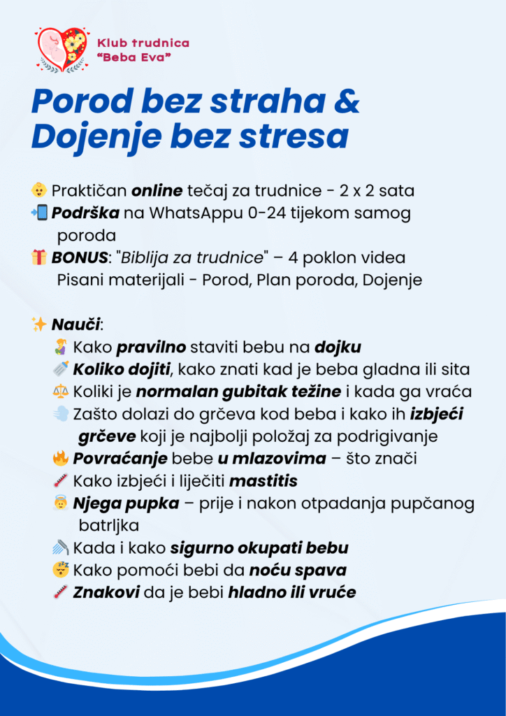 Dok s nestrpljenjem iščekuješ taj poseban trenutak poroda, prirodno je osjećati dozu neizvjesnosti. Naš tečaj osmišljen je kako bi te osnažio znanjem i vještinama, pružajući ti jasan i smiren put kroz završne faze trudnoće i sam prirodan porod. Želimo da se osjećaš pripremljeno i sigurno!